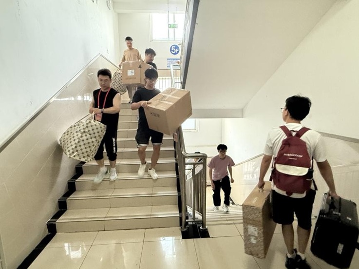 七月的天气炎热,气温持续攀升,但志愿者们不惧酷暑,始终坚守岗位。即便汗水湿透衣衫,他们依然保持着积极的工作态度,毫无怨言,用实际行动诠释了奉献精神。在整个搬迁过程中,学院副书记和辅导员们亲临现场,在宿舍楼下进行统筹协调与指导协助,及时解决搬迁过程中出现的问题。师生齐心协力,充分展现了电子信息与工程学院强大的凝聚力和团队协作精神。