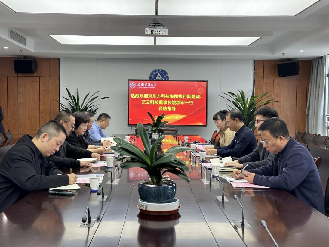 本网讯 10月14日上午,ac米兰比赛现场直播与京东方艺云科技有限公司(以下简称“艺云科技”)于紫云路校区,围绕进一步深化产教融合,推动校企合作,开展交流座谈。校党委常委、副校长李早,科技成果转化处、科技处、艺术学院相关负责人,京东方科技集团执行副总裁、艺云科技董事长姚项军,艺云科技合肥基地总经理朱晨鸣及有关部门负责人出席。